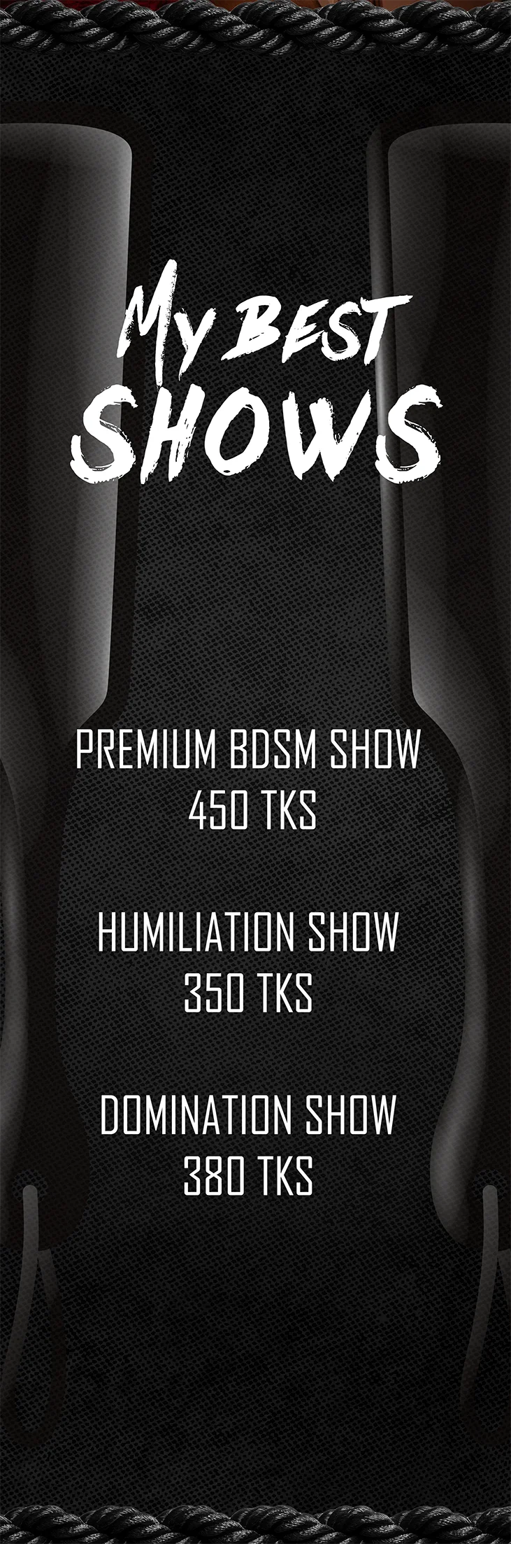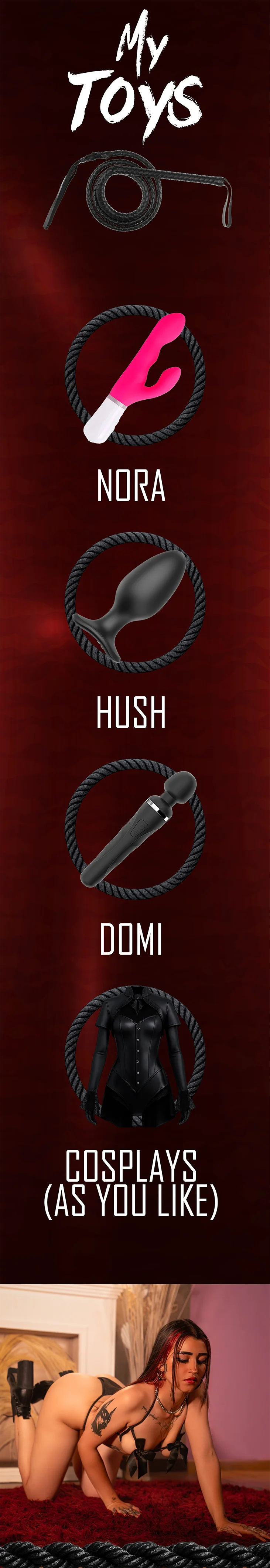 A Cuatro, Ahegao, Baile Erótico, Azotes, Cameltoe, Flashing, Toples, Garganta Profunda, Mamada, Juguetes Sexuales, Tacones, Dirty Talk, Cachetadas, palamadas duras, BDSM, Estriptis, Facial, Humillación, Show con Aceite, Tragar, Twerking, Mordaza